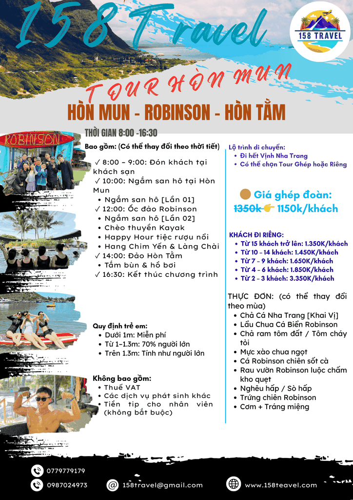Tour Hòn Mun – Robinson – Hòn Tằm hứa hẹn sẽ mang đến cho bạn một ngày trải nghiệm trọn vẹn, kết hợp khám phá – vui chơi – nghỉ dưỡng, để hành trình Nha Trang trở thành kỷ niệm khó quên.